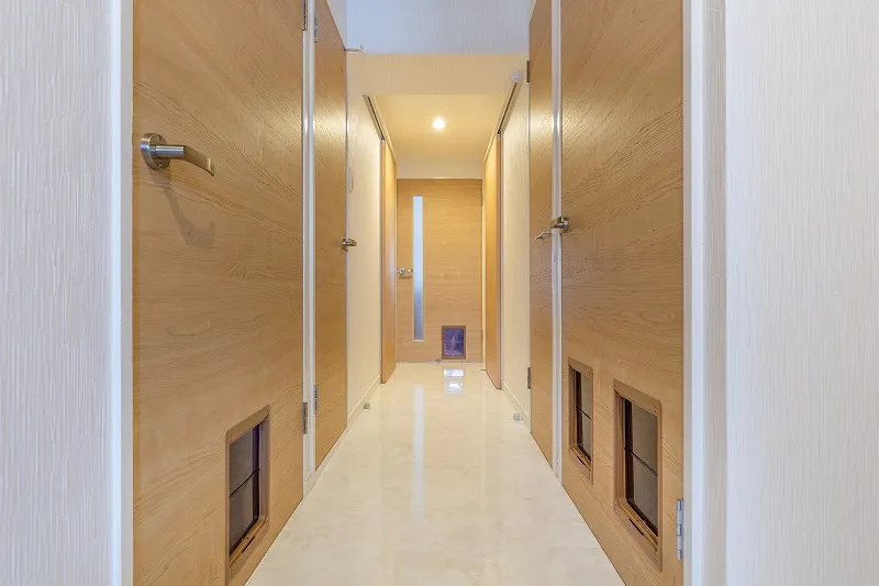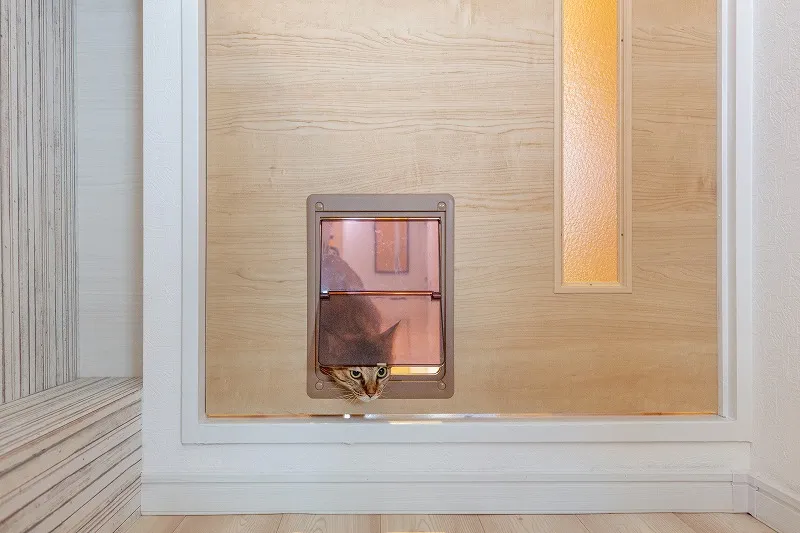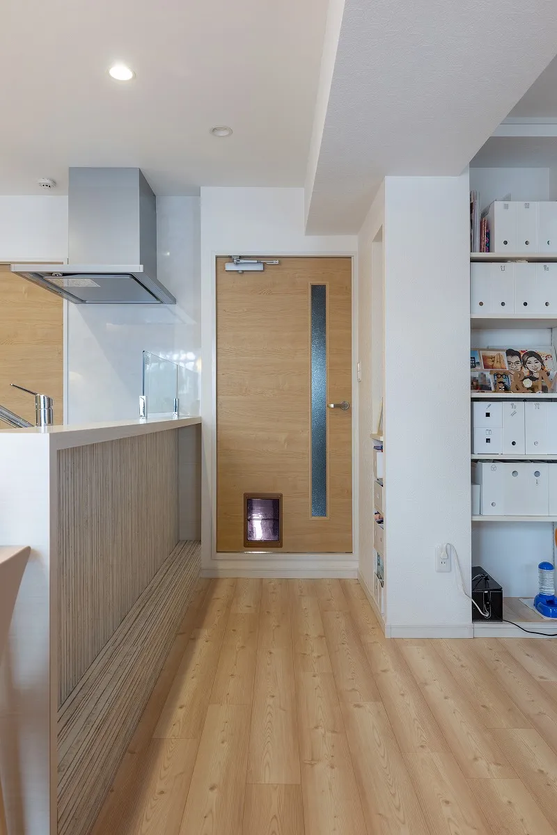 ペットドアを設けて、2匹の愛猫が家の中を自由に行き来できるようにしました。
