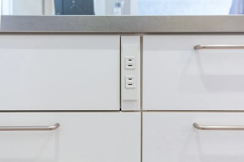 キッチン前面にコンセントを設置。「ハンドミキサーを使う時に便利です」と奥様。