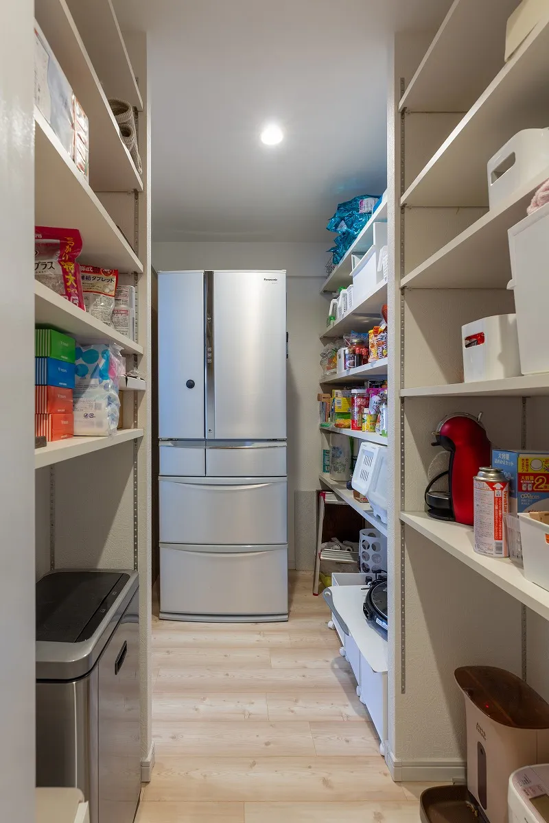 冷蔵庫も収まり、可動棚で高さを調整できる大型パントリー。ここからキッチンへも廊下へも行き来ができます。
