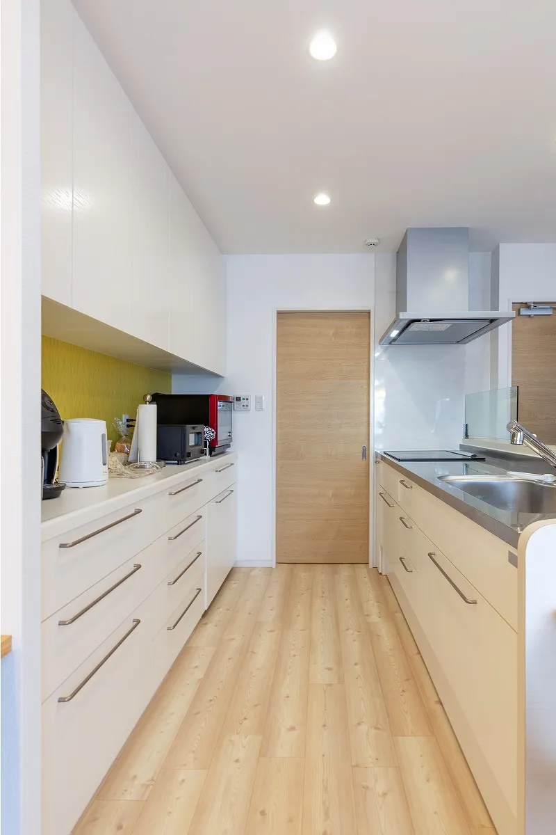 ウッド調のメラミンパネルを貼ったキッチンは、インテリアの一部のように空間に溶け込んでいます。