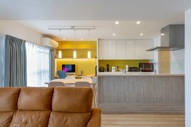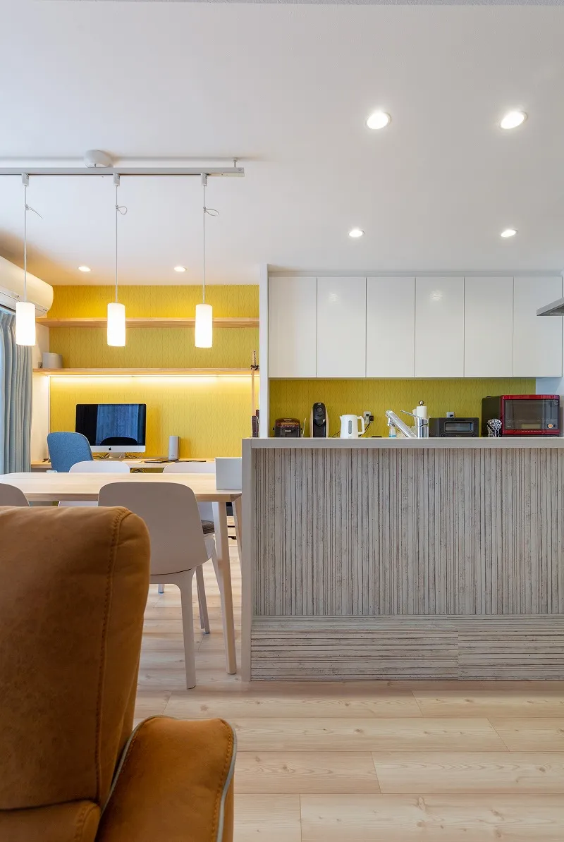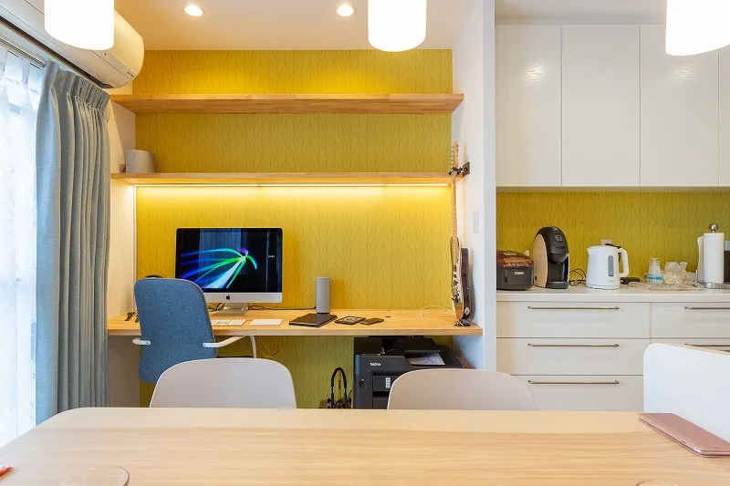 LDKの一角に夫のスタディデスクを造作。「どこかに色が欲しかったから」と、ご主人のセレクトでアクセントクロスを貼り、施主支給の照明を弊社で施工しました