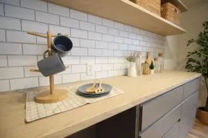 カップボード壁面は吊戸棚にしてしまわず、棚板にラタンのバスケットで収納することで圧迫感をなくし、タイルも映えさせることができます。