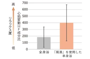 実際に、全身浴でお風呂に浸かるより半身浴で肩湯を使用した際のリラックス度は約2倍も違うことが研究結果にて判明しているようです。