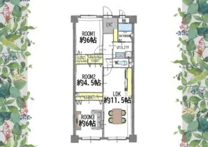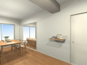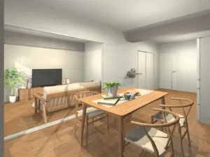 ・基本床仕上げ:フロアタイル・ROOM2床仕上:遮音フローリング・建具更新・クロス全面貼り替え・玄関収納