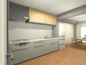リノベーション工事内容 ◆キッチン工事 ・オリジナルキッチン・ビルトイン食器乾燥機・蛇口一体型浄水器 ◆水廻り工事 ・ユニットバス取り替え・浴室乾燥暖房機・洗濯機パン、洗濯水栓交換・シャワートイレ・給湯器取り替え(追い焚き)・洗面化粧台 ◆内装工事 ・基本床仕上げ:フロアタイル・ROOM2床仕上:遮音フローリング・建具更新・クロス全面貼り替え・玄関収納
