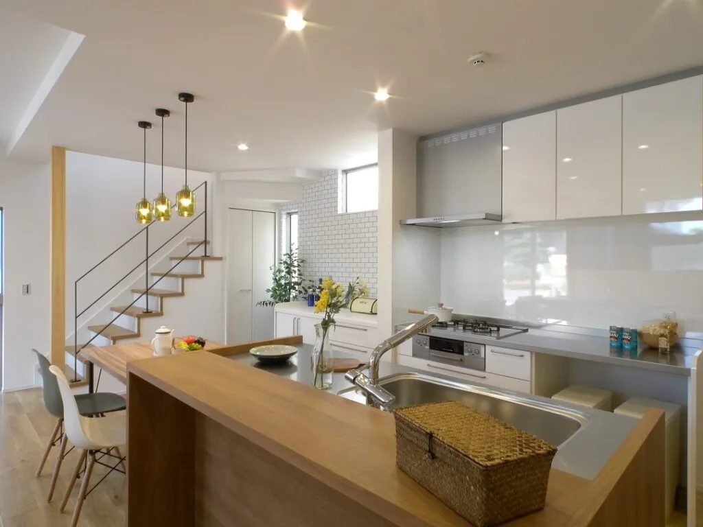 ペニンシュラとは英語で「半島」という意味。キッチン部分が壁から半島のように突き出ていることから、ペニンシュラキッチンと呼ばれていて、現代キッチンのスタンダードタイプです。