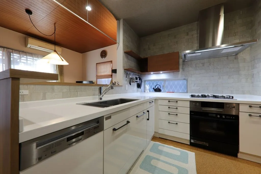 L字にキッチンを配置することで、限られた場所でも広い調理スペースを確保できるタイプです。作業面積が広く、動線が短くなることがメリットですが、L字のコーナー部分がどうしてもデッドスペースになってしまいます。