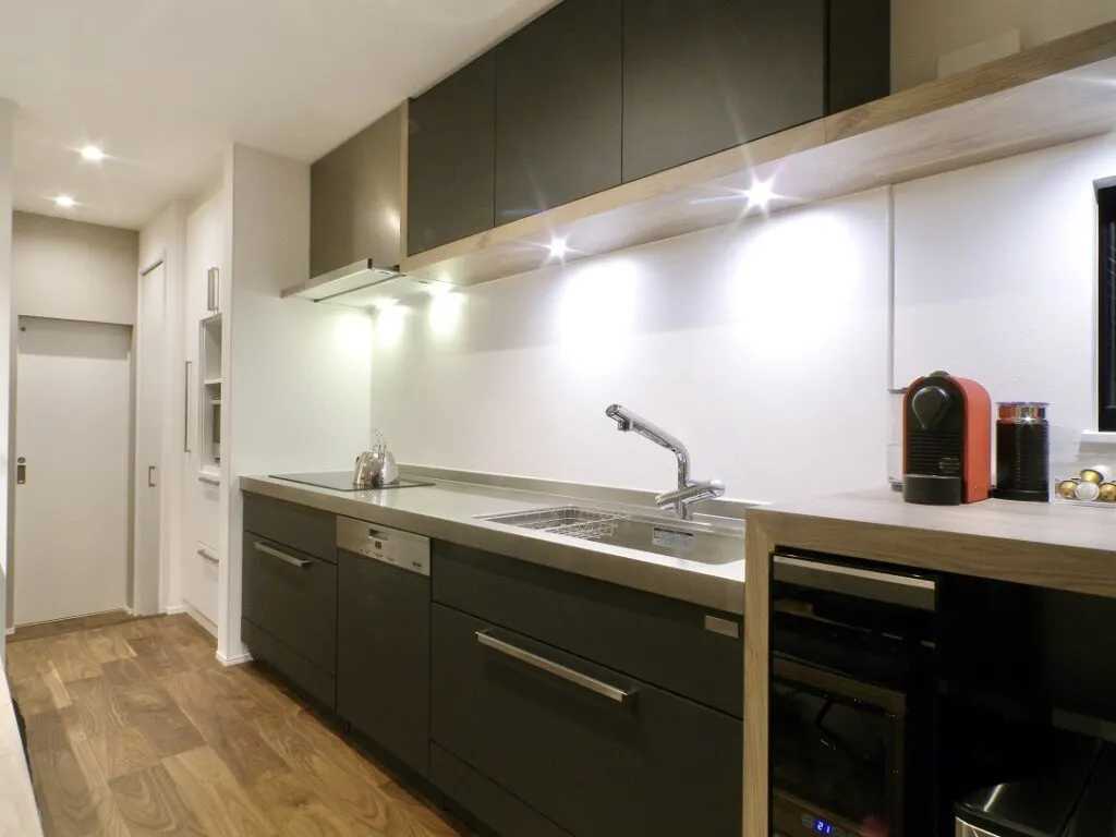 L字にキッチンを配置することで、限られた場所でも広い調理スペースを確保できるタイプです。作業面積が広く、動線が短くなることがメリットですが、L字のコーナー部分がどうしてもデッドスペースになってしまいます。